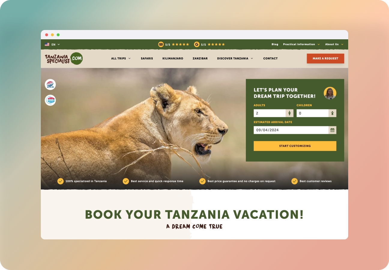 Tanzania Specialist werft zijn klanten voornamelijk online, terwijl het grootste deel van de operationele activiteiten in Tanzania plaatsvindt. Dit omvat de gidsen, de voertuigenvloot en de marketingafdeling die zich richt op diverse taalgebieden. Samen met ons team van websiteontwikkelaars en UX-designers hebben we een dynamische, meertalige website ontwikkeld. Deze website spreekt niet alleen een breed internationaal publiek aan, maar werkt ook naadloos samen met Proposal Meister, een geavanceerd systeem dat ons helpt gepersonaliseerde reisvoorstellen te maken voor bezoekers.